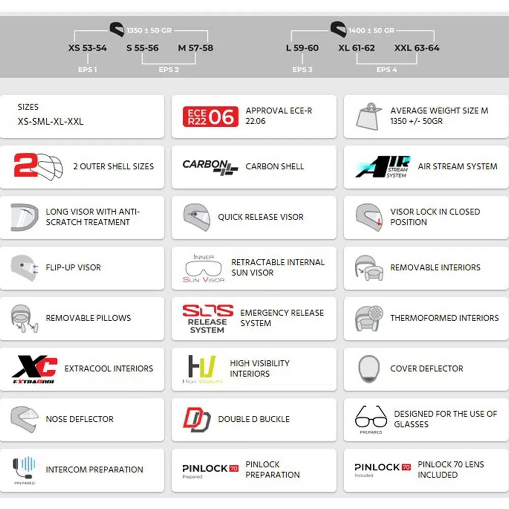 EXTRACOOL kumaştan üretilen iç pedler ve yan pedler çıkarılabilir, yıkanabilir ve gözlük kullanımına olanak tanır. Çift D bağlantı sistemi, yanak pedleri için geliştirilen SOS Release acil çıkarma sistemi ve iç yüzeydeki yüksek görünürlüklü şeritler güvenlik özelliklerini tamamlar. Basınç deflektörü, hava girişini engelleyerek stabilite ve sessizliği artırır. Kask ayrıca burunluk, elastik kayış tutucu ve interkom uyumluluğu ile donatılmıştır.