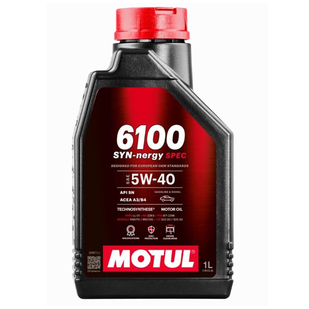 Motul 6100 SYN-NERGY SPEC 5W-40, yüksek performans ve yüksek koruma sağlayan gelişmiş sentetik Technosynthese® motor yağıdır. Benzinli ve dizel motorlarla uyumludur; doğal emişli veya turboşarjlı, dolaylı veya doğrudan enjeksiyonlu güçlü ve yeni araçlar için özel olarak tasarlanmıştır. Bu yağ, MERCEDES, VAG (Volkswagen, Audi, Skoda, Seat ve Cupra), BMW, CHRYSLER, FORD, FIAT, PORSCHE, STELLANTIS (Peugeot, Citroën, DS) ve RENAULT gibi çoğu Avrupa OEM'si tarafından önerilmektedir.