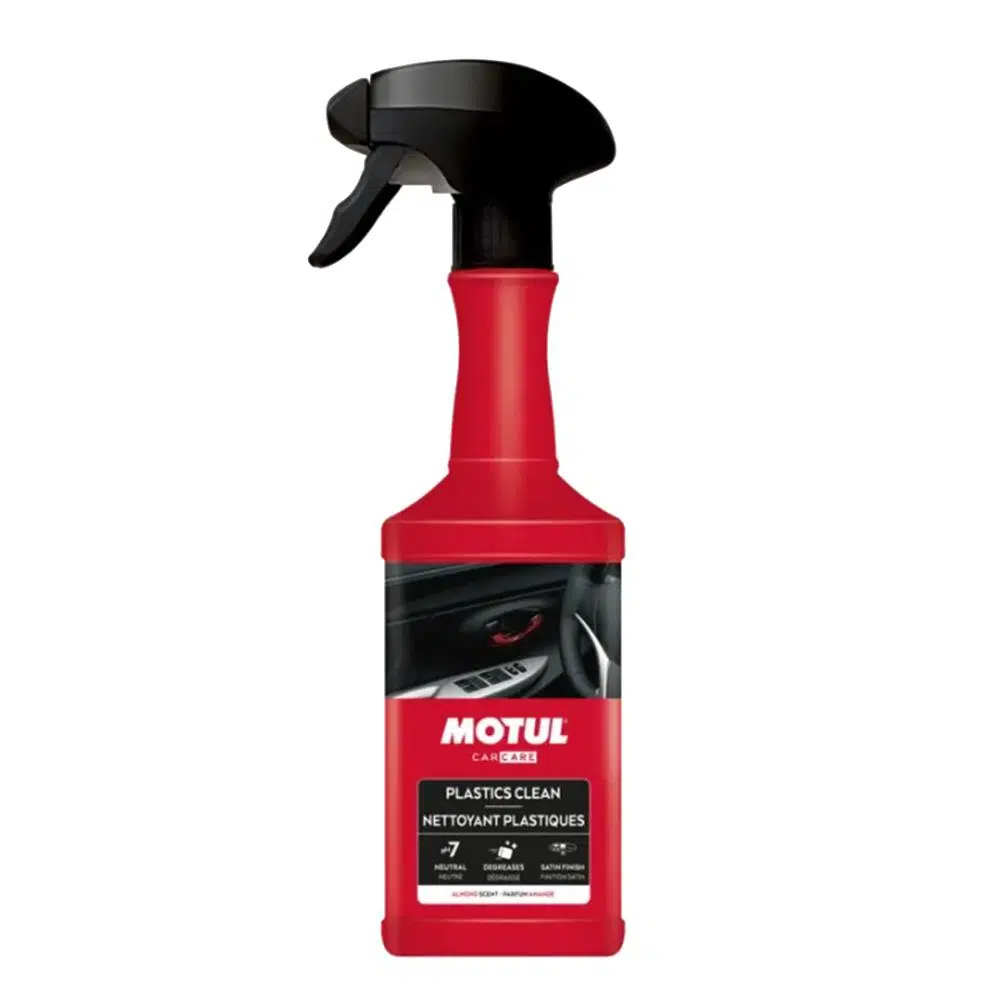 MOTUL® Plastics Clean tozu kaldırır ve yolcu bölümündeki tüm plastik yüzeyleri temizler (gösterge paneli, kapı panelleri, karbon tipi kompozit elementleri, ekranlar, vb.), arkasında hoş bir koku ve dokunması hoş saten bir doku bırakır.