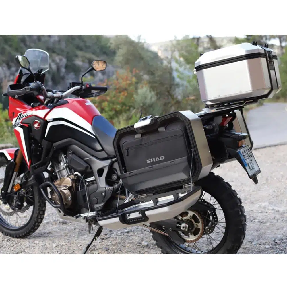 SHAD Terra yan çantaları, yeni 4P yan çanta montaj sistemi ile kullanılmak üzere tasarlanmıştır ve bir kez monte edildikten sonra, tüm eşyalarınıza kolay erişim ve tam görünüm sağlayan yan açılı sistem sunar. Bu sistem, eşyalarınızı yerinde tutmak için (yol dışında katlanabilen) paket tepsisi ve ağ restrains sistemi ile birlikte gelir.