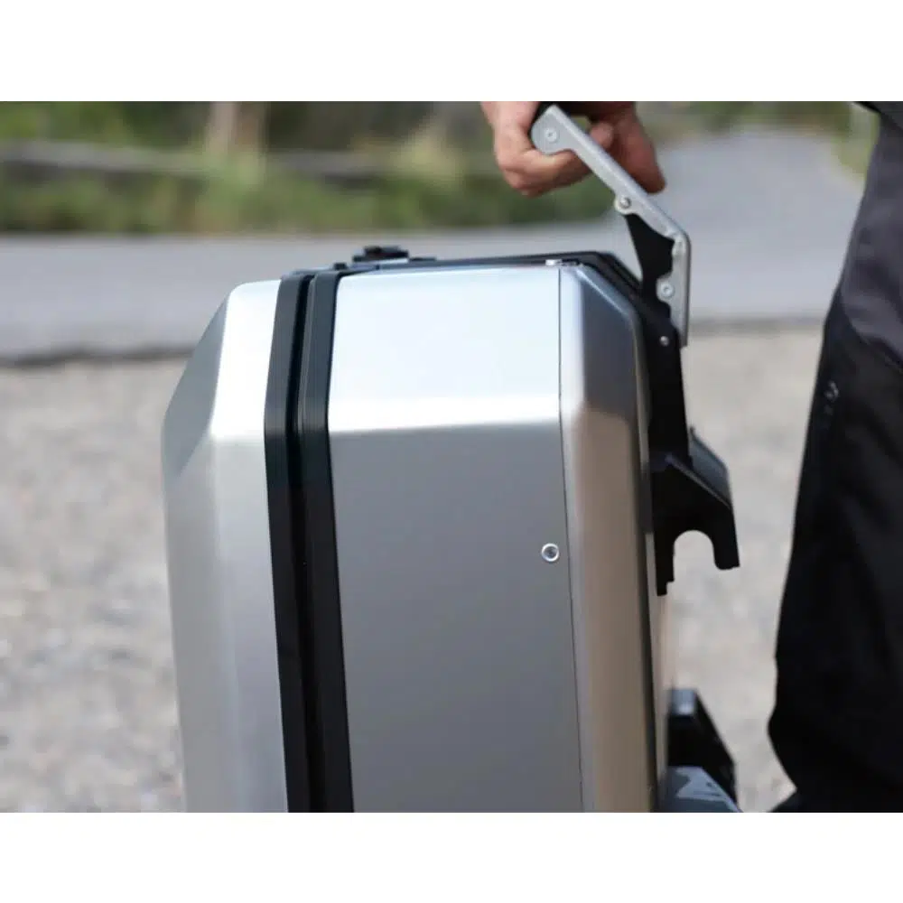 SHAD TR47 yan çantası, dövme alüminyum alaşımdan yapılmıştır; bu, daha güçlü ve hafif bir alüminyum türüdür ve çantanın daha ince ve hafif olmasını sağlar, ancak daha ağır çantalar kadar dayanıklıdır.